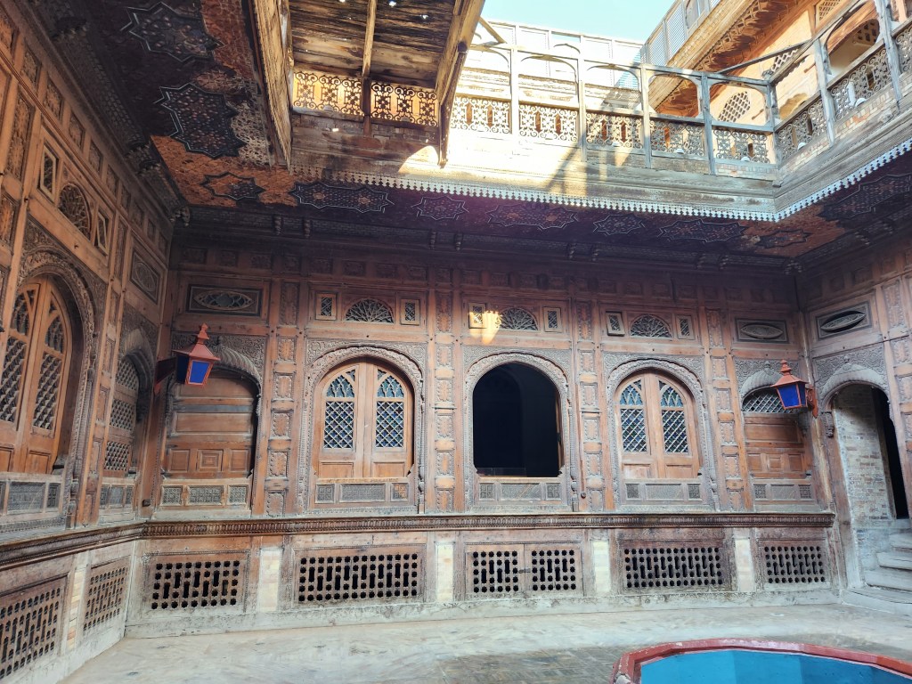 The house features elaborately carved wooden doors, balconies, and jharokas (overhanging enclosed balconies), which are distinctive elements of the architecture.
